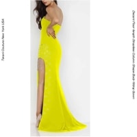 鮮やかなレモンイエローのストレッチクレープで デザインされた太ももまでのビジュフリンジ付きスリットが 魅力的なちょっとセクシーなスレンダードレス ドーム型のスリットはビジュのフリンジで 更に目を引くように仕向けられていますね! 更にスリット周りには囲むように クリスタルビジュの刺繍が施されて シンプルなドレスに 素晴らしいアクセントを与えています トップは6本のボーンが入った プリンセスシーム仕上げで美しい3Dボディ