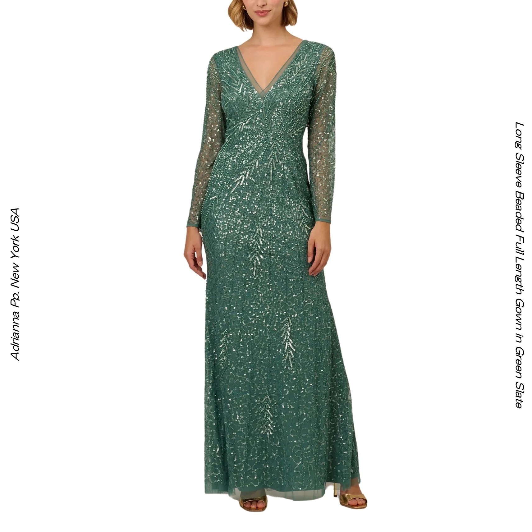 ニューヨークの人気ブランドADRIANNA P.(アドリアーナ・P)より、非常に珍しい色合いGREEN SLATEのロングドレス。